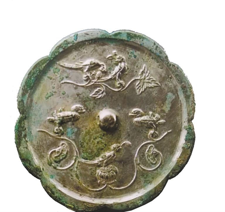 隋唐時(shí)期是中國(guó)封建政治經(jīng)濟(jì)文化高度發(fā)展繁榮的時(shí)期,唐代社會(huì)經(jīng)濟(jì)全面發(fā)展,手工業(yè)各部門(mén)也都興旺發(fā)達(dá),青銅鑄造業(yè)中的銅鏡業(yè)尤為突出,無(wú)論造型、題材、紋飾、鑄造工藝,都突破了前代的模式,達(dá)到了中國(guó)古代銅鏡藝術(shù)的巔峰。唐鏡鏡型厚實(shí),方形鏡、菱花形鏡、葵花形鏡流行;紋飾題材多見(jiàn)瑞獸、飛鳥(niǎo)以及葡萄、花草等;瑞獸葡萄鏡最具特色,是中西文化融合的杰作。