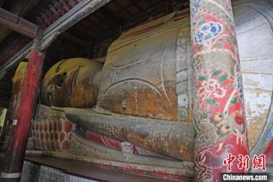 12月中旬,甘肅張掖大佛寺中重要文物的“數(shù)字孿生”打造工作已進入新階段。圖為木胎泥塑臥佛?!钇G敏 攝