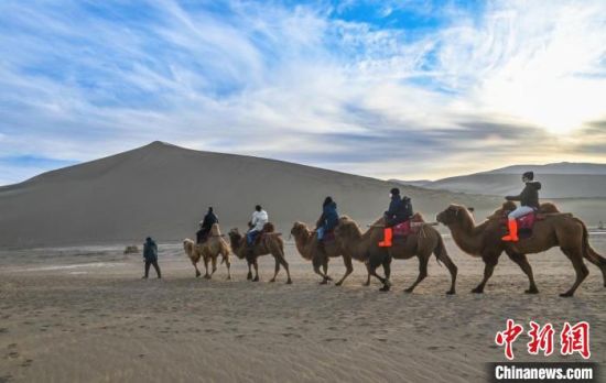 新年伊始,游客在敦煌鳴沙山騎駱駝欣賞大漠風(fēng)光?!⊥醣筱y 攝
