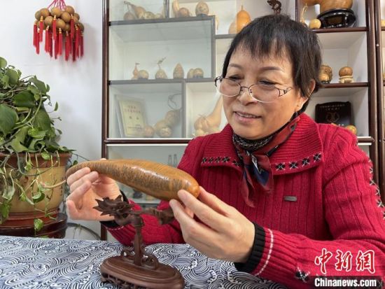 圖為長(zhǎng)約二十公分的長(zhǎng)條葫蘆雕刻佛教經(jīng)文作品。 張婧 攝