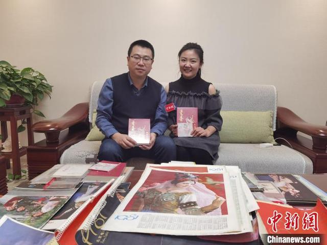 圖為陳曉斌(左)向中新網(wǎng)記者介紹他所收藏的舞劇《絲路花雨》相關(guān)珍貴資料情況。 崔琳 攝