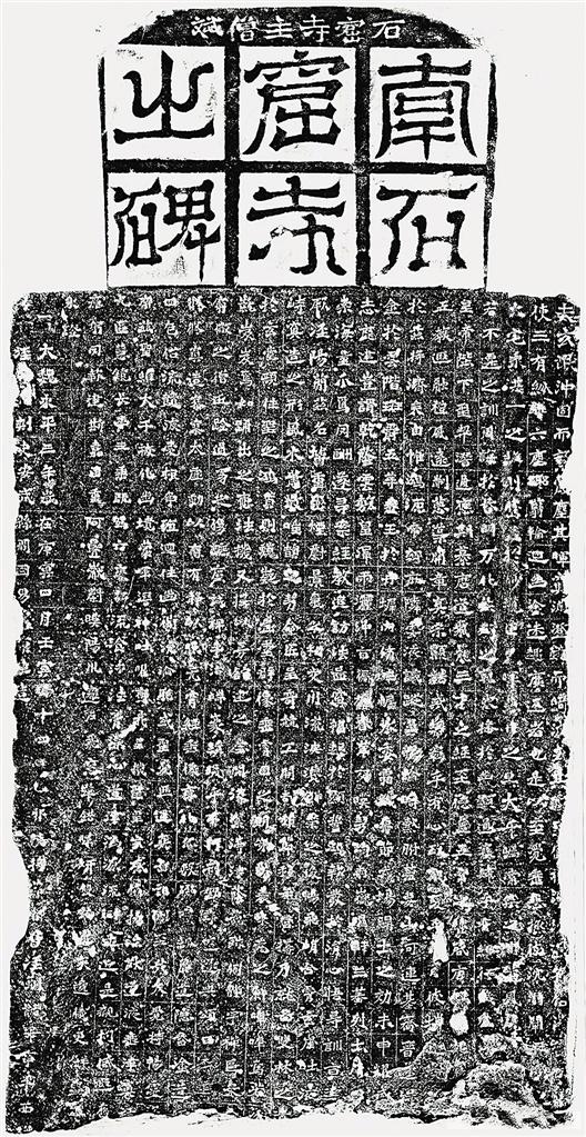 “南石窟寺之碑”原存涇川縣王家溝村南石窟寺。1912年間,當?shù)卣畬⑵湟浦每h文廟予以陳列保護,現(xiàn)存涇川縣王母宮石窟寺文管所。碑通高225厘米,寬105厘米,厚17厘米,題額為“符文式”篆書陽刻“南石窟寺之碑”,額上橫列楷書云:“石窟寺主僧斌”。碑文楷書23行,行38字,因碑下部有斷缺,現(xiàn)每行最多存34字。碑文記載了奚康生創(chuàng)建南石窟寺的功德,碑陰有出資修建石窟的施主題名,共3列,計56人。
