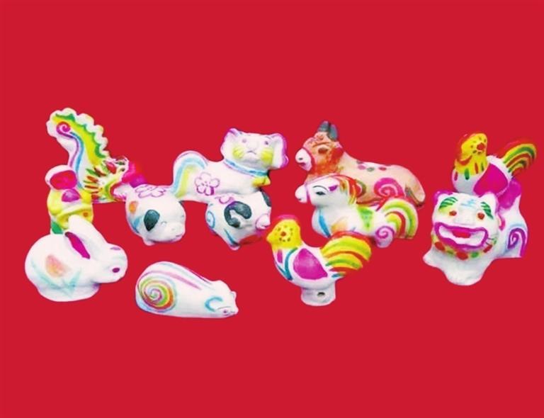窯貨則是用和好的膠泥捏制晾干后,再燒制涂彩,以單件作品為主,有羊哨、狗哨、馬哨、鴿子哨等,這些作品相同的特性是裝上做好的竹笛即可發(fā)出不同的聲音。