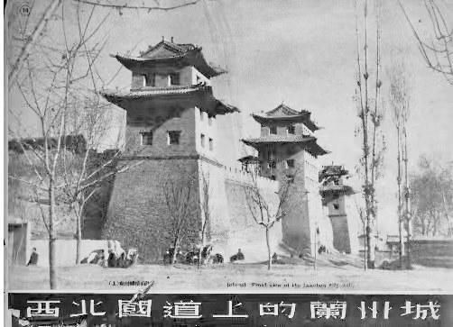 特別難得的是,他拍下了一張?zhí)m州城樓的照片,這是筆者見過的所有蘭州城樓中最壯觀的。照片上,中間的城門和兩個角樓并行排列,角樓前面是幾株西北地區(qū)常見的高聳挺拔的白楊樹,角樓底下是幾個正在等客人的黃包車夫。這座城樓是蘭州東郭城門迎恩門,俗稱東稍門(位于今東方紅廣場東口什字),中間有城門洞,南北兩側為角樓,無城門洞。
