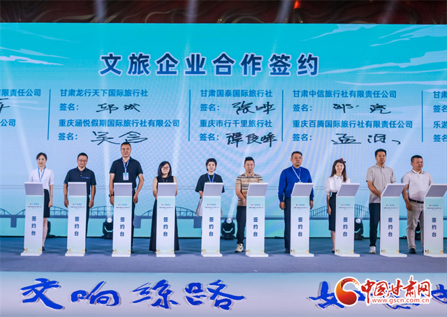 推介會上,蘭州、隴南兩地文旅部門分別作了當?shù)匚穆觅Y源主題推介。甘肅蘭鐵國際旅行社與重慶和平國際旅行社;甘肅蘭神國際旅行社與重慶西美國際旅行社;嘉峪關(guān)君和國際旅行社與重慶渝之旅國際旅行社等兩地的20家文旅企業(yè)(旅行社)代表分別簽訂了《甘渝客源互送合作協(xié)議》。