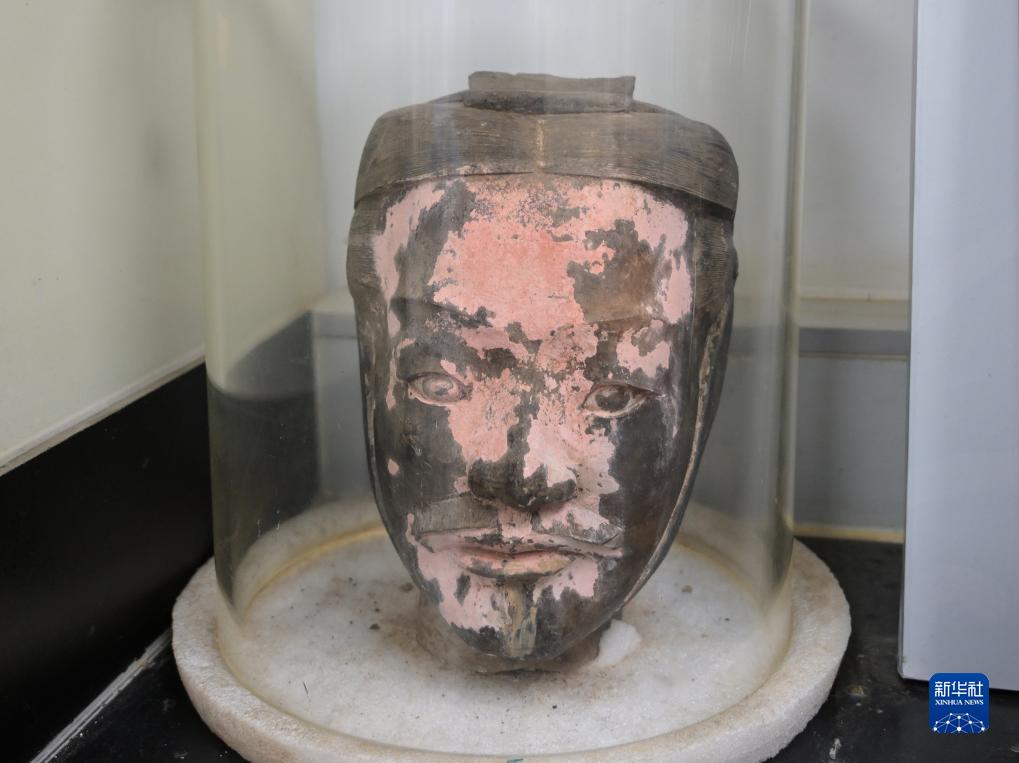 在秦始皇帝陵博物院文物保護部彩色陶俑修復室內,一尊秦俑臉部尚存部分彩繪層(8月23日攝)。
