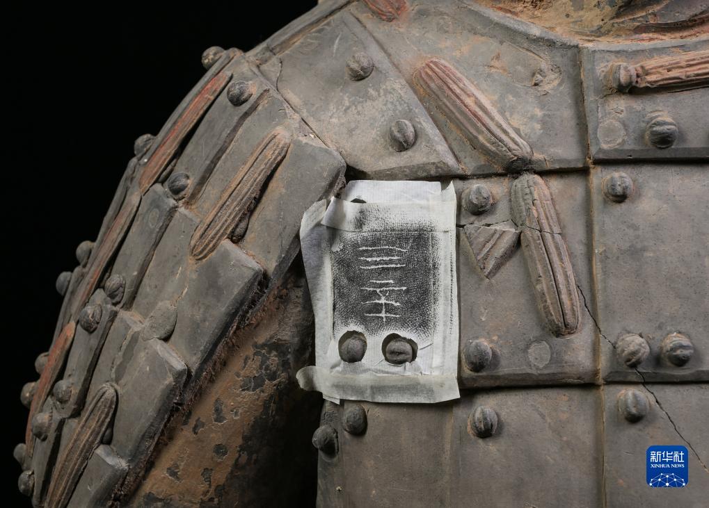 在秦始皇帝陵博物院文物保護部彩色陶俑修復室內,修復人員使用墨拓技術在一尊秦俑的胸前甲片上還原出“三辛”字樣的刻痕。據介紹,這應是制作該秦俑的秦代工匠名(8月23日攝)。
