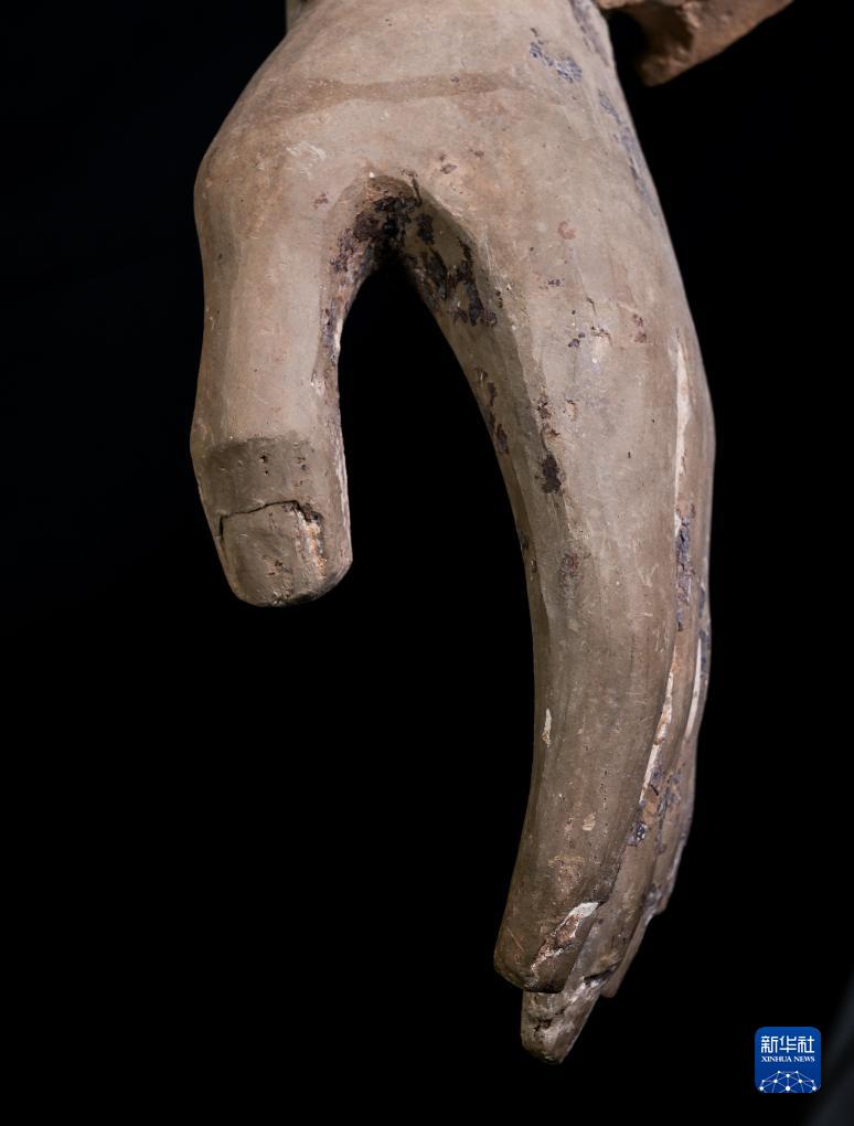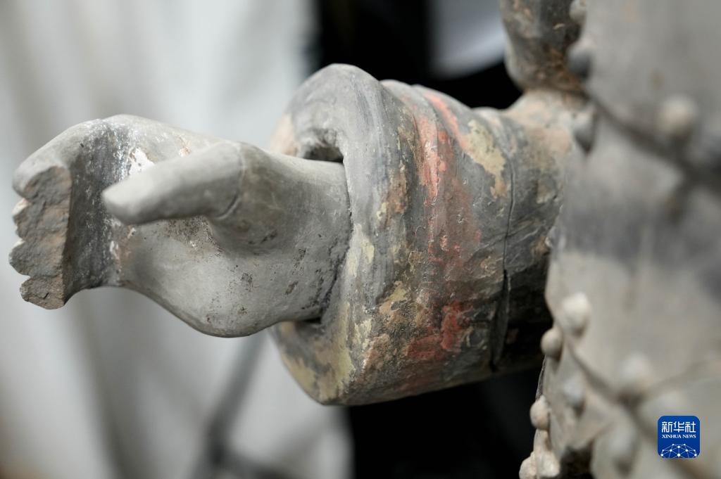 在秦始皇帝陵博物院文物保護部彩色陶俑修復室內,一尊秦俑的手部特寫顯示出豐富的細節(jié)(8月23日攝)。