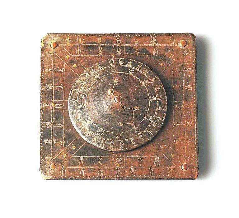 1972年武威市磨嘴子漢墓出土的這件漆栻盤(pán),直徑6厘米,厚1厘米,地盤(pán)邊長(zhǎng)9厘米,木胎,髹深褐色漆。由圓形的天盤(pán)和方形的地盤(pán)構(gòu)制而成,天盤(pán)位于地盤(pán)之上,正中心以竹軸貫聯(lián),使天盤(pán)可以轉(zhuǎn)動(dòng)。天盤(pán)中陰刻兩個(gè)同心圓,將其分為三區(qū):內(nèi)區(qū)以竹珠鑲嵌北斗七星,星間刻線相連,斗柄中節(jié)穿過(guò)圓心。中區(qū)內(nèi)隸書(shū)陰刻十二月神,外區(qū)陰刻篆書(shū)二十八宿名。地盤(pán)以兩個(gè)相套的正方形分為三區(qū):內(nèi)區(qū)納天盤(pán),中區(qū)陰刻篆書(shū)十天干中的八干(不刻戊己)和十二地支名,外區(qū)陰刻篆書(shū)二十八宿名。