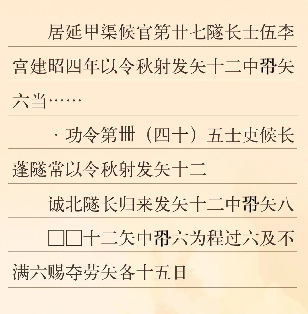 漢代對于官吏的考核分為文職和武職。文職主要考核書寫能力、治理能力、財務(wù)能力、法律能力等;武職考核主要是一年一度的射箭考核,因為在秋季舉行,故稱為“秋射”,發(fā)十二箭,中六箭為合格(即“中程”)。河西邊塞的官府通過秋射這一活動,借以考察和檢驗邊塞吏員們的軍事技術(shù)水平,并以此作為賜勞和奪勞的依據(jù)。為了提高吏員們的射箭技術(shù),邊塞官府還派專人來管理訓(xùn)練吏卒。邊塞參加秋射的主要是烽燧的燧長、部塞的候長、候官的候等吏員。