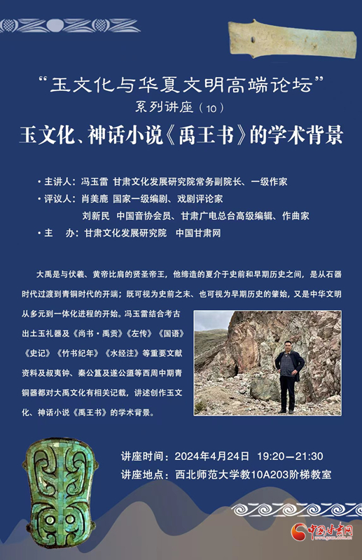 4月24日晚,馮玉雷講座“玉文化、神話小說《禹王書》的學(xué)術(shù)背景”在西北師范大學(xué)舉辦。這次講座是甘肅文化發(fā)展研究院和中國甘肅網(wǎng)聯(lián)合舉辦的“玉文化玉華夏文明高端論壇”系列講座第十講,也是近期啟動(dòng)的“巡禮馬銜山:玉文化與文學(xué)融合發(fā)展”系列活動(dòng)之一,甘肅文化發(fā)展研究院常務(wù)副院長、一級作家馮玉雷主講,國家一級編劇、戲劇評論家肖美鹿,中國音協(xié)會(huì)員、甘肅廣電總臺高級編輯、作曲家劉新民擔(dān)綱學(xué)術(shù)評議嘉賓。