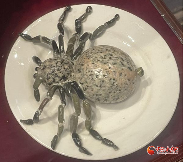 兩個花紋沒啥特點、一大一小的圓形石頭,再加上更細小的石粒,竟然被創(chuàng)作者粘連起來,打造成了一只“蜘蛛”,惟妙惟肖。