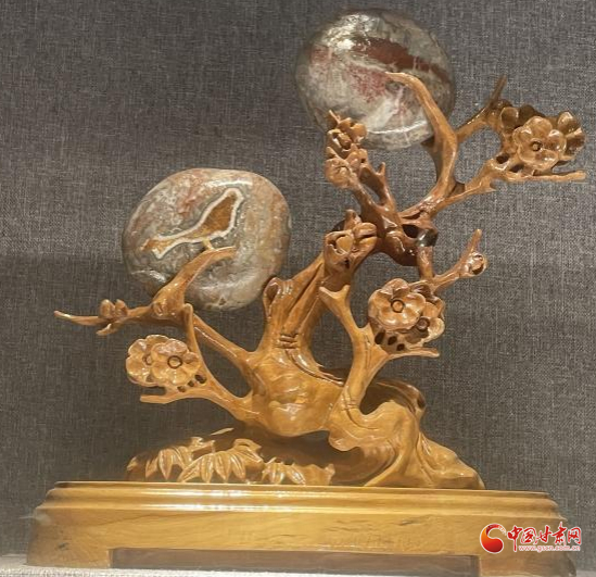 還有兩塊看似普通的小石頭,用樹根雕成的花架支撐起來,上方的石頭似圓月當空,下面的一塊花紋石,花紋類似一只鳥,這件作品起名“枝頭戀歌”,不得不佩服創(chuàng)作者的浪漫情懷。