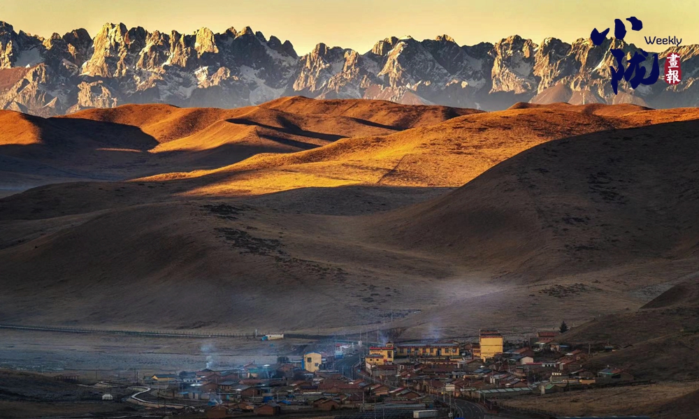 遠(yuǎn)處連綿的群山白雪皚皚,山下青黃的草甸、安靜的藏式小村、飄蕩的經(jīng)幡、裊裊炊煙,勾勒出一幅美麗的畫(huà)。