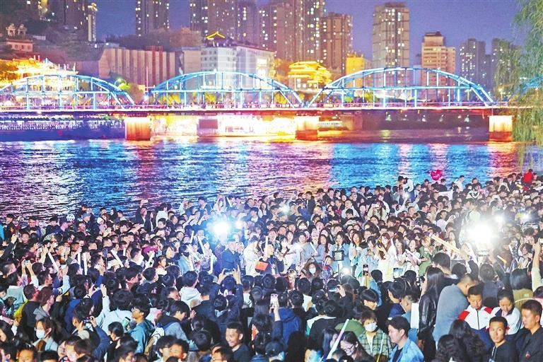 作為蘭州的地標(biāo)之一,中山橋已經(jīng)是來(lái)蘭游客必“打卡”的景點(diǎn)?;馃?ldquo;出圈”的“黃河大合唱”成為蘭州旅游新體驗(yàn)。華燈初上,游客和市民齊聚黃河岸邊,隨著音樂(lè)齊聲合唱,場(chǎng)面壯觀,氣氛熱烈。“五一”假期首日,蘭州文旅市場(chǎng)迎來(lái)火爆“開(kāi)門(mén)紅”,接待游客達(dá)到了86.42萬(wàn)人次。