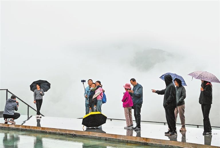 在綿綿細(xì)雨中,麥積奇峰時(shí)隱時(shí)現(xiàn),吸引游客慕名而來(lái)感受“麥積煙雨”的魅力。新甘肅·甘肅日?qǐng)?bào)記者 田 蹊