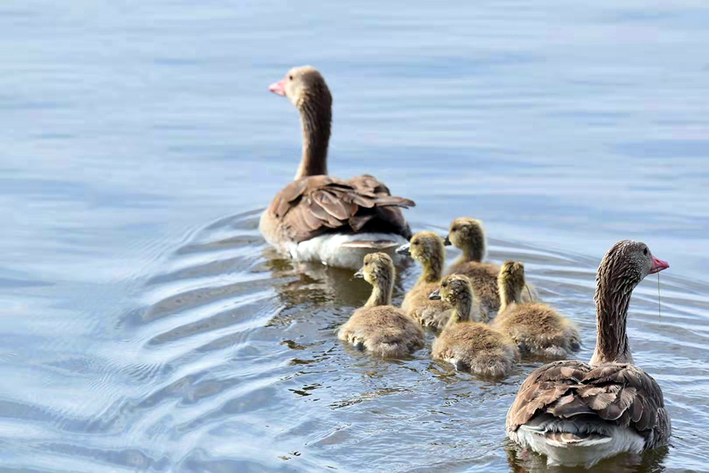 灰雁是鴨科雁屬鳥類,屬國家重點(diǎn)保護(hù)的“三有”鳥類,也是陽關(guān)濕地的夏候鳥。監(jiān)測顯示,在陽關(guān)濕地繁殖的灰雁家族有100多只。每年3月下旬遷飛至陽關(guān)濕地,4月中旬筑巢繁殖,5月上旬孵化出雛鳥4至5只?;已銥?ldquo;一夫一妻”制,孵化由雌鳥單獨(dú)承擔(dān),雄鳥在巢附近負(fù)責(zé)警戒。待雛鳥破殼出窩后,則由雌雄共同撫育?;已闵阅懶?、機(jī)警,小寶寶溜達(dá)時(shí),雌鳥在前開道,雄鳥負(fù)責(zé)斷后,小寶寶上岸覓食嫩草芽時(shí),雄鳥仍然負(fù)責(zé)警戒,若有危險(xiǎn)立刻鳴叫警示。故而,近距離拍攝灰雁雛鳥是比較困難的。