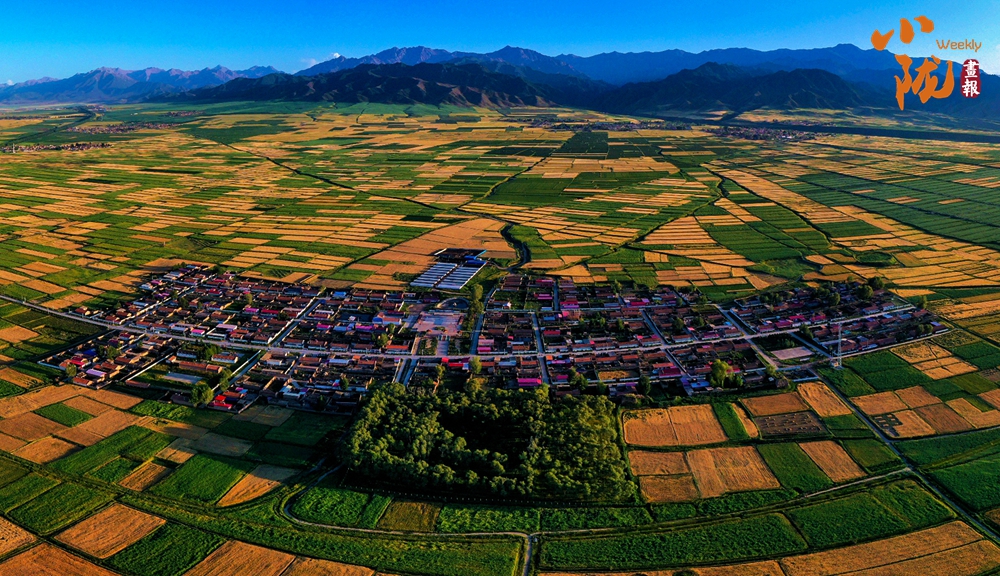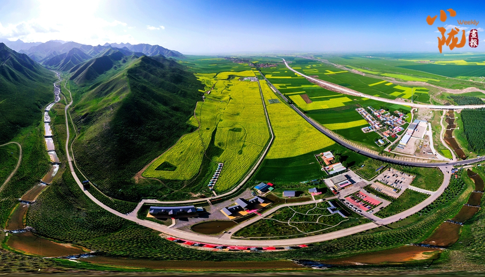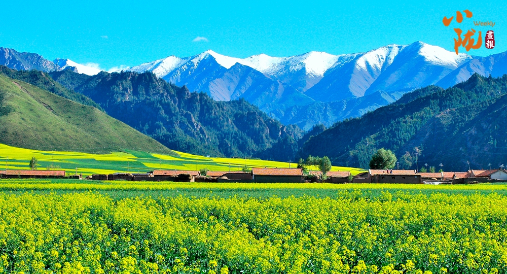 在藍(lán)天白云和祁連雪峰的映襯下,那盛開的油菜花、點(diǎn)綴在花海中的村莊人家,勾勒出一幅優(yōu)美的田園風(fēng)光畫卷。