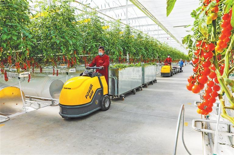 古浪越海農(nóng)業(yè)有限公司智能溫室內(nèi),務(wù)工人員運送小番茄。 武威市融媒體中心供圖