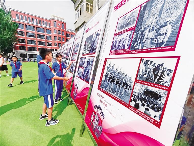 活動現(xiàn)場,該館講解員給孩子們講述了《抗戰(zhàn)烽火中的少年兒童》及《英雄血灑黃河畔——叢德滋》紅色故事。之后,蘭州市口琴藝術交流學會的成員現(xiàn)場演奏了《沒有共產(chǎn)黨就沒有新中國》《游擊隊之歌》《中國少年先鋒隊隊歌》等經(jīng)典紅色曲目。圖為學生觀看展板。
