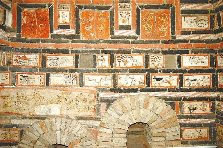 魏晉十六國(guó)磚畫在墓中的布局、組合,體現(xiàn)出 “滿”和“層”的特點(diǎn)。整個(gè)墓室,各方位、各邊角以及過道均鑲砌畫磚。以嘉峪關(guān)果園—新城5號(hào)墓畫磚的布局為例,各層間隔、同層緊鄰的畫磚,給觀者的感覺就是整幅壁畫,但每一塊又是一個(gè)獨(dú)立的畫面,這種“樣式”,是魏晉十六國(guó)時(shí)期的河西匠工、畫工,在繼承漢晉磚室墓的同時(shí),將畫像磚在墓室布局的方式也加以接受。艷麗的色彩,“忠實(shí)”生活的寫實(shí)手法,又是河西畫匠們的創(chuàng)新和發(fā)揮。
