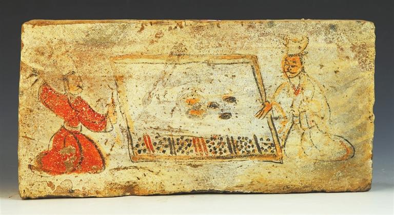 除此之外,河西彩繪壁畫磚圖像中,還有一些反映娛樂的圖像,主要有樂舞圖和六博圖。高臺(tái)地埂坡壁畫中的“角抵百戲”中,一著辮者在作表演,他小腿部網(wǎng)狀綁腿,蹲踞,雙手?jǐn)傞_,似乎是在表演魔術(shù),又似乎是在歡迎到場(chǎng)的人們。“擊鼓”中,兩人網(wǎng)狀繃腿,髡發(fā)梳辮,著黑裝者背鼓,著紅裝者持雙鼓槌準(zhǔn)備擊鼓。孫機(jī)先生謂,戰(zhàn)國(guó)迄漢盛行六博,博具和博戲的圖像在考古資料中不乏其例。甘肅以武威磨嘴子漢墓出土木六博俑為例。六博俑以簡(jiǎn)單明確的藝術(shù)造型,刻畫了兩個(gè)老者全神貫注博弈的場(chǎng)面,惟妙惟肖地表現(xiàn)出對(duì)弈時(shí)蓄勢(shì)待發(fā)的場(chǎng)面。在高臺(tái)壁畫墓中的博戲場(chǎng)面略有不同,二博者戴船形帽,打手勢(shì)。從相貌看,很可能是少數(shù)民族。高臺(tái)出土彩繪壁畫磚上,兩人動(dòng)作幅度更大,左邊一人的黃紅色著裝和博具上的零散物品,顯得場(chǎng)面更為熱烈激情。