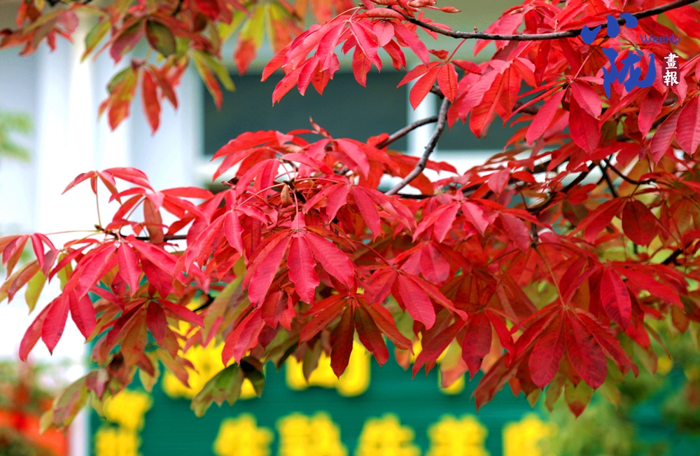 淡淡的秋霜將樹葉染成綺麗多彩的鮮紅和金黃,與綠葉共舞,層層疊疊,在凋零中展現(xiàn)生命的堅(jiān)韌。
