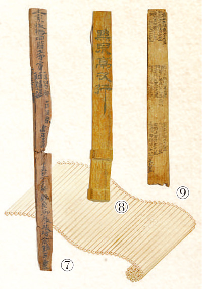 圖⑦⑧⑨:懸泉置遺址出土漢簡(jiǎn)。其中,圖⑦為郵書(shū)刺刻齒簡(jiǎn)。甘肅簡(jiǎn)牘博物館供圖