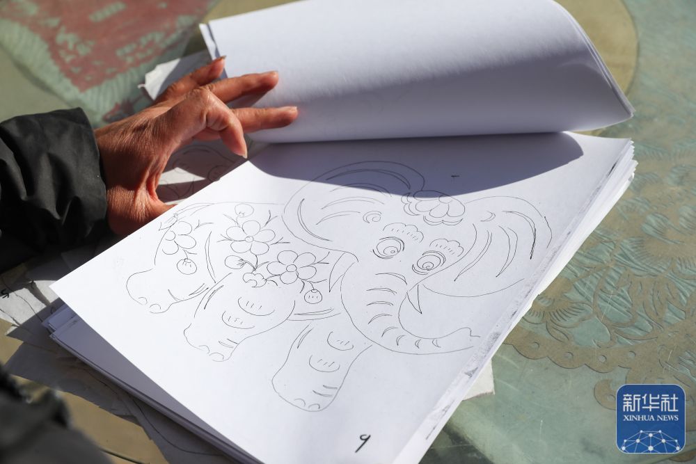 1月5日,在慶陽(yáng)市合水縣西華池鎮(zhèn)唐旗村,張雪峰展示創(chuàng)作黃河古象主題剪紙時(shí)的草稿。