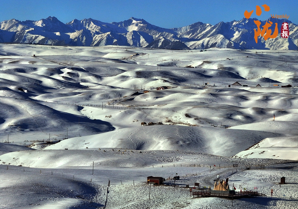 藍(lán)天如洗,鋪滿白雪的草原,與群山相映,蒼茫無(wú)際,呈現(xiàn)出安然素美的意境。