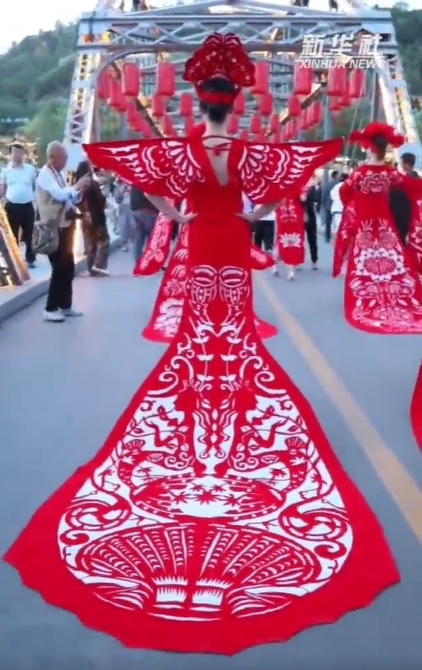 慶陽(yáng)剪紙?jiān)从谏睢⒅v究情趣,是勞動(dòng)人民生產(chǎn)生活、情感氣質(zhì)、觀念習(xí)俗和文化傳承的結(jié)晶。著名民俗學(xué)家靳之林先生稱剪紙藝人是“真正的藝術(shù)家”。1986年,中央美術(shù)學(xué)院邀請(qǐng)鎮(zhèn)原縣民間美術(shù)大師祁秀梅赴北京進(jìn)行民間美術(shù)教學(xué)交流,向大學(xué)生演示民間剪紙。法國(guó)、日本、澳大利亞等國(guó)家的藝術(shù)家也多次專程到隴東考察民間剪紙藝術(shù)。慶陽(yáng)剪紙已由鄉(xiāng)村婦女手中的小玩意,堂而皇之地步入了國(guó)家藝術(shù)殿堂——中國(guó)民間美術(shù)館,并在日、意、澳等國(guó)家展覽亮相。圖為身著慶陽(yáng)剪紙服裝的模特們行走在蘭州中山橋上,驚艷了來(lái)往的游客。