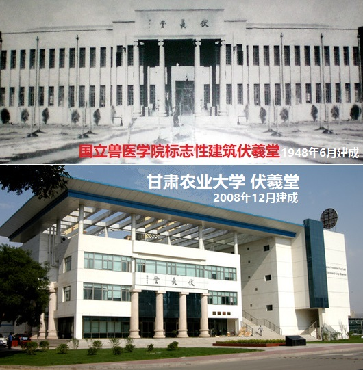 1946年10月國(guó)立獸醫(yī)學(xué)院成立后,于1948年6月建成了當(dāng)年蘭州最雄偉壯觀的建筑——伏羲堂。有深厚國(guó)學(xué)功底的校長(zhǎng)盛彤笙,為紀(jì)念人文始祖伏羲氏在認(rèn)識(shí)自然、適應(yīng)自然、改造自然和發(fā)展生產(chǎn)生活的過(guò)程中,所進(jìn)行的一系列造福人類的發(fā)明創(chuàng)造,將這幢教學(xué)大樓命名為“伏羲堂”,并親自撰寫了一篇銘文《伏羲堂記》,“用追前烈,以志建堂之艱難”。
