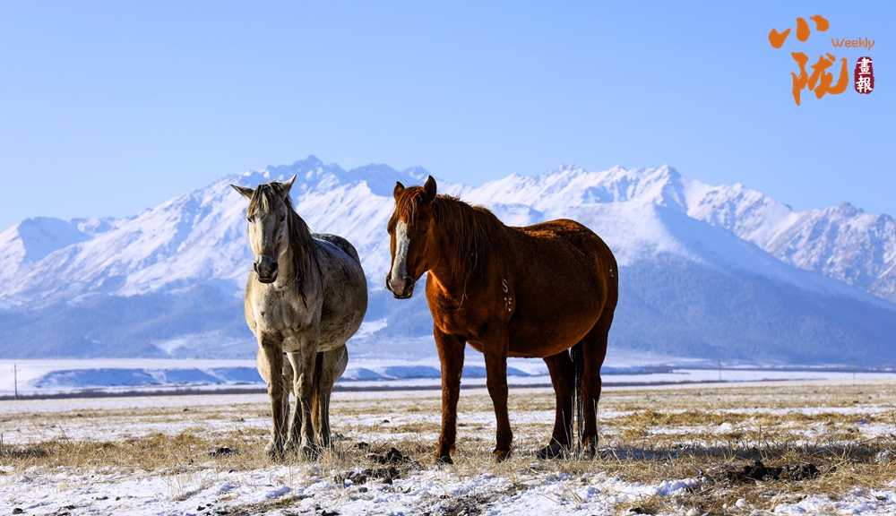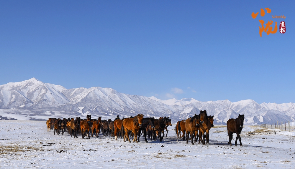 一場春雪后,山丹馬場天空湛藍(lán),祁連山巍巍壯觀。成群的駿馬在這片廣袤無垠的草原上或低頭吃草,或奔跑嬉戲,成為雪地里一道靚麗的風(fēng)景。