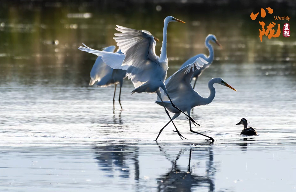 湖中的白鷺翩翩起舞,嬉鬧翻飛,歡快鳴叫,有的停落湖岸,有的游向湖心,有的翻飛空中,為游客帶來無盡的歡樂。看鳥兒們嬉鬧,仿佛回到童年時(shí)代。自由、自在、生機(jī)無限,讓每個(gè)人感受到無窮的生命力量。