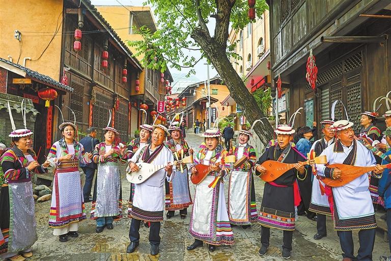 在文縣鐵樓藏族鄉(xiāng)草河壩村白馬山寨,土琵琶彈唱表演吸引游客駐足觀賞。新甘肅·甘肅日報記者 馮樂凱