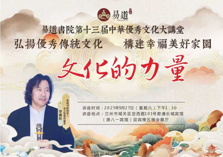 響應(yīng)時(shí)代號(hào)召,弘揚(yáng)傳統(tǒng)文化,旨在文化賦能行業(yè)發(fā)展,易道書院第十三屆中華優(yōu)秀文化大講堂將于9月27日在蘭州君通長城賓館(原八一賓館)迎賓樓五樓會(huì)展廳開講,誠邀有志之士共襄盛舉,學(xué)習(xí)傳統(tǒng)文化,賦能行業(yè)文明,構(gòu)建美好家園!