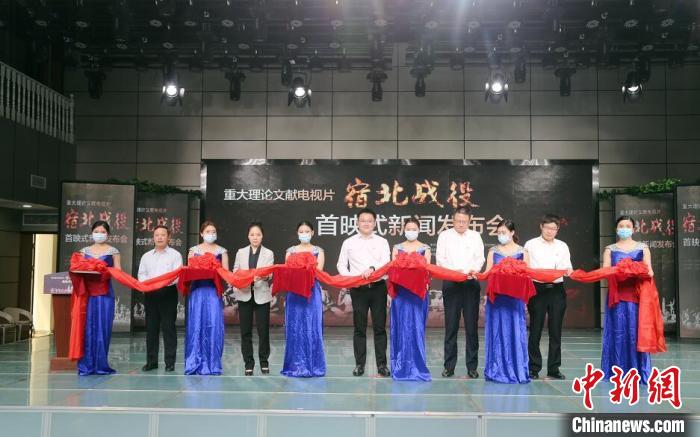 江蘇省宿遷市宿豫區(qū)電視臺分會場進(jìn)行《宿北戰(zhàn)役》首映剪彩儀式?!⒘帧z