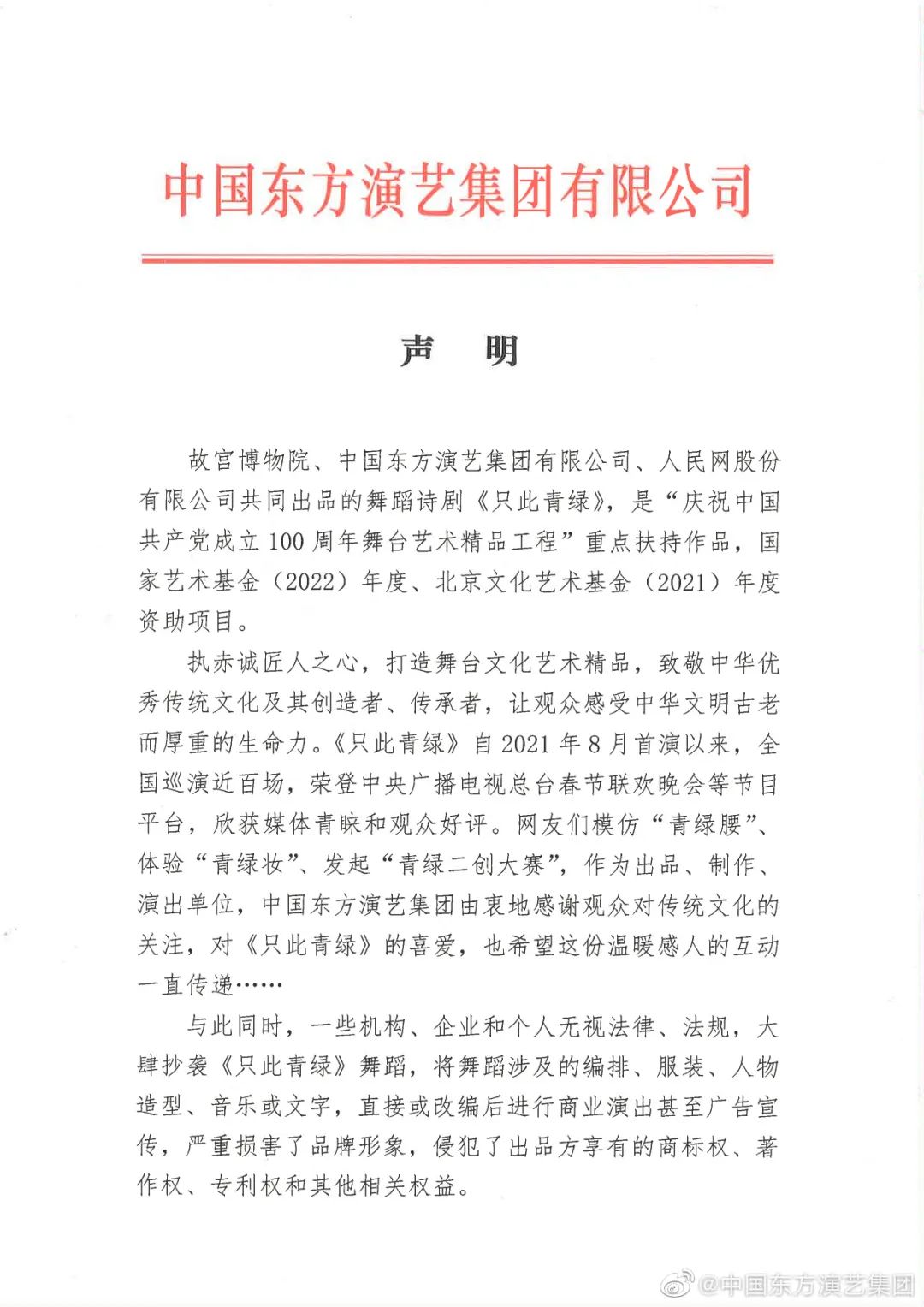 此次在聲明中,中國東方演藝集團呼吁廣大觀眾和消費者,支持原創(chuàng)劇目創(chuàng)作,支持正版劇目演出,攜手共建全社會保護知識產(chǎn)權(quán)的良好生態(tài)。