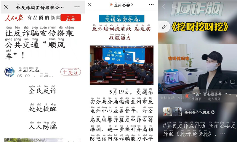 反電詐宣傳專班利用多媒體平臺錄制反電詐版“挖呀挖”,在各媒介平臺進行了展播,廣大民輔警實時瀏覽并積極轉(zhuǎn)發(fā)。同時,在中央及省市媒體廣泛刊發(fā)“五一”小長假反詐宣傳不放假、讓反詐騙宣傳搭乘公共交通“順風(fēng)車”、全警參與、協(xié)同互動,讓蘭州市公安局交通治安分局防范電信網(wǎng)絡(luò)詐騙宣傳工作再發(fā)力。