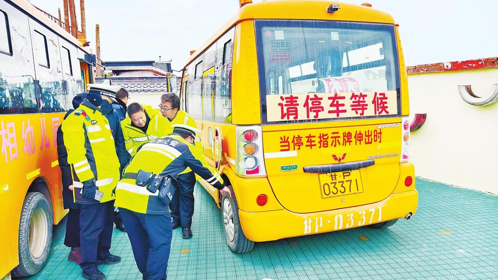 民警在檢查幼兒園校車。開學(xué)在即,為保障學(xué)生上下學(xué)乘車安全,2月18日,臨潭縣公安局交警大隊聯(lián)合縣交通運輸局對校車開展“安全體檢”。 新甘肅·甘肅法治報記者金凡裕攝