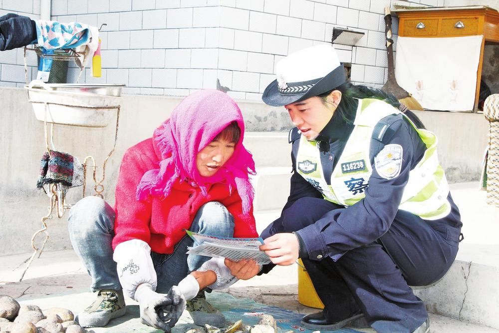 民警向群眾宣傳交通安全知識(shí)。3月10日,臨洮縣公安局交警大隊(duì)民警走村入戶,開展交通安全宣傳活動(dòng)。新甘肅·甘肅法治報(bào)通訊員楊小娟攝