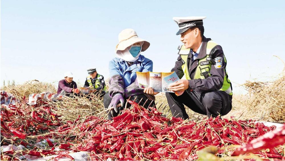 民警在田間地頭向群眾講解交通安全知識(shí)。近日,高臺(tái)縣公安局交通管理大隊(duì)駱駝城交警中隊(duì)民輔警通過發(fā)放宣傳資料、以案釋法、與村民面對(duì)面交流等方式,宣傳道路交通安全法律法規(guī),維護(hù)好豐收季節(jié)農(nóng)村道路交通秩序。新甘肅·甘肅法治報(bào)通訊員 蔣雯麗 攝