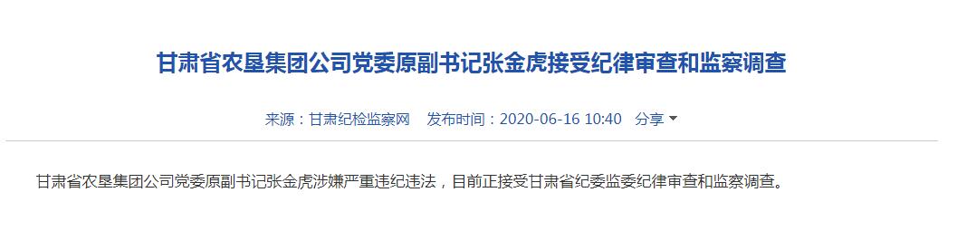 甘肅省農(nóng)墾集團公司黨委原副書記張金虎涉嫌嚴重違紀違法,目前正接受甘肅省紀委監(jiān)委紀律審查和監(jiān)察調(diào)查。