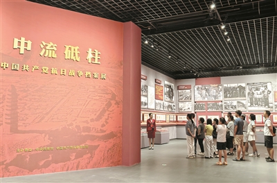 走進(jìn)中國共產(chǎn)黨歷史展覽館四層專題展廳,首先看到一面紅底金字的大型展板,形似一本翻開的書本。“書”的正面,“中流砥柱”四個(gè)大字在燈光照射下閃閃發(fā)亮,下方緊跟一行小字“中國共產(chǎn)黨抗日戰(zhàn)爭檔案展”;側(cè)面,金色字體展示著毛澤東同志《中國共產(chǎn)黨在民族戰(zhàn)爭中的地位》里的內(nèi)容:“每一個(gè)共產(chǎn)黨員必須發(fā)揮其全部的積極性,英勇堅(jiān)決地走上民族解放戰(zhàn)爭的戰(zhàn)場,拿槍口瞄準(zhǔn)日本侵略者。”
