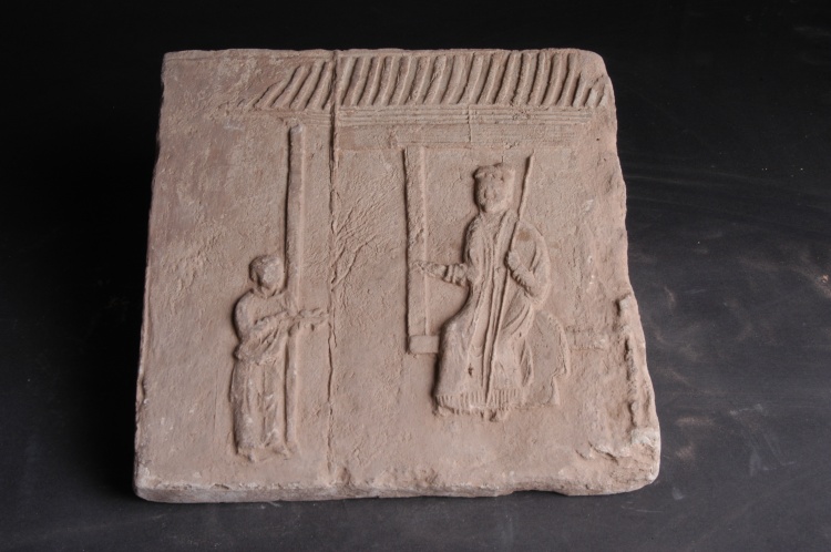 宋代??v30.2厘米,橫30.7厘米,厚3厘米。征集。磚呈長方形,青灰色,通過模印工藝展示了屋檐下一婦人坐于窗臺前,給一端物的幼子訓(xùn)話的場景,是研究宋代社會生活、家庭倫理及畫像磚藝術(shù)的珍貴實物資料。