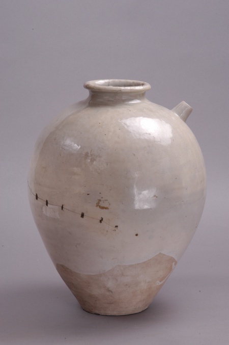 唐代,移交,初出土于武威弘化公主墓。高40.5厘米,口徑12厘米,底徑12.3厘米。圓唇,小口外卷沿,束頸,圓肩,下腹斜收,平底。肩部斜置一管狀短流。胎表有白色化妝土,通體施白釉,釉不及底,釉面光潤且有細(xì)碎冰裂紋。器身無花紋,造型規(guī)整、飽滿,具有鮮明的唐代風(fēng)格。