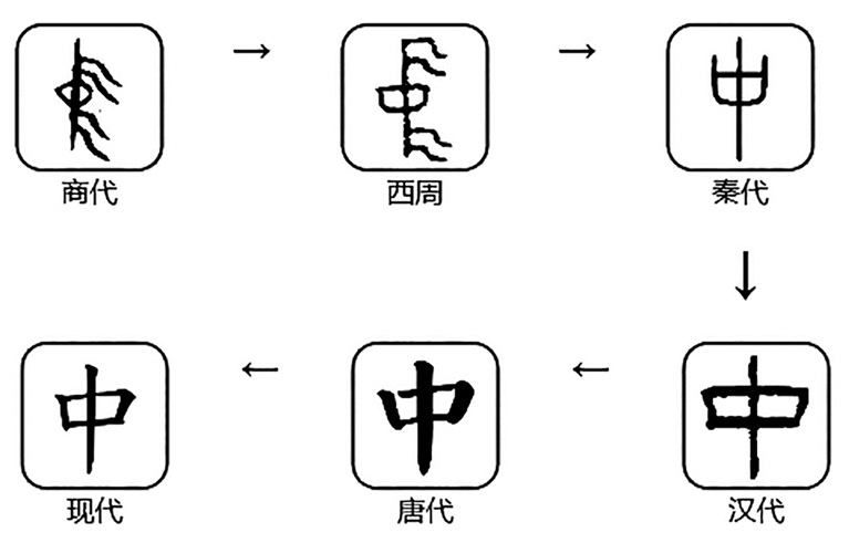 甲骨文“中”象旗幟之形,其上下部都有飄帶。直線(xiàn)的中間加上圈形指示符號(hào),表示中央、中點(diǎn)等一般含義。秦系簡(jiǎn)牘的“中”字省略了象征斿的部分,小篆和隸書(shū)字形中間的圈形又變?yōu)榉叫?,成為了現(xiàn)在楷書(shū)的“中”。