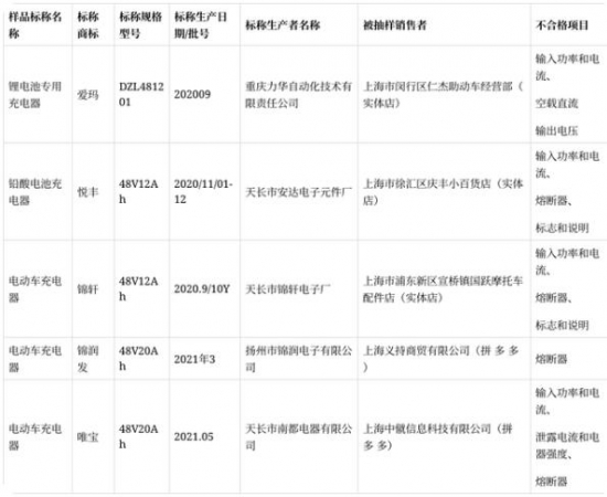 2021年長三角聯(lián)動(上海)電動自行車用充電器產(chǎn)品質(zhì)量監(jiān)督抽查不合格產(chǎn)品