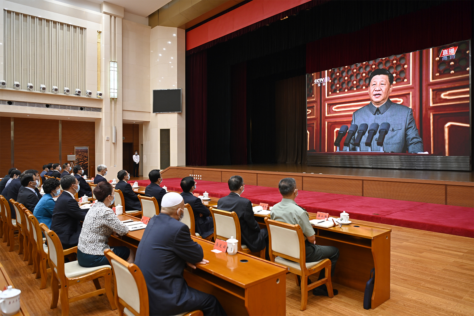 7時53分許,在歡快的樂曲聲中,習(xí)近平等黨和國家領(lǐng)導(dǎo)人來到天安門城樓主席臺,會場爆發(fā)出熱烈的掌聲。8時整,慶祝大會開始,中國人民解放軍聯(lián)合軍樂團奏響雄壯的《義勇軍進行曲》,尹弘、任振鶴等全體起立,隨北京現(xiàn)場一起高唱中華人民共和國國歌,目視大屏幕里鮮艷奪目的五星紅旗冉冉升起,在天安門廣場上空迎風(fēng)飄揚。在熱烈的掌聲中,習(xí)近平總書記發(fā)表重要講話,大家認真聆聽、專心筆記,第一時間深刻學(xué)習(xí)領(lǐng)會,不時報以熱烈的掌聲。