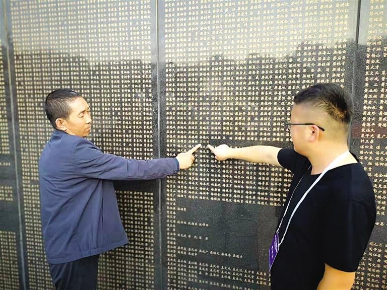 梁德保和梁潤全(右)在烈士陵園的英名墻上找到了親人的名字(甘肅省退役軍人事務(wù)廳 章小冬 供圖)